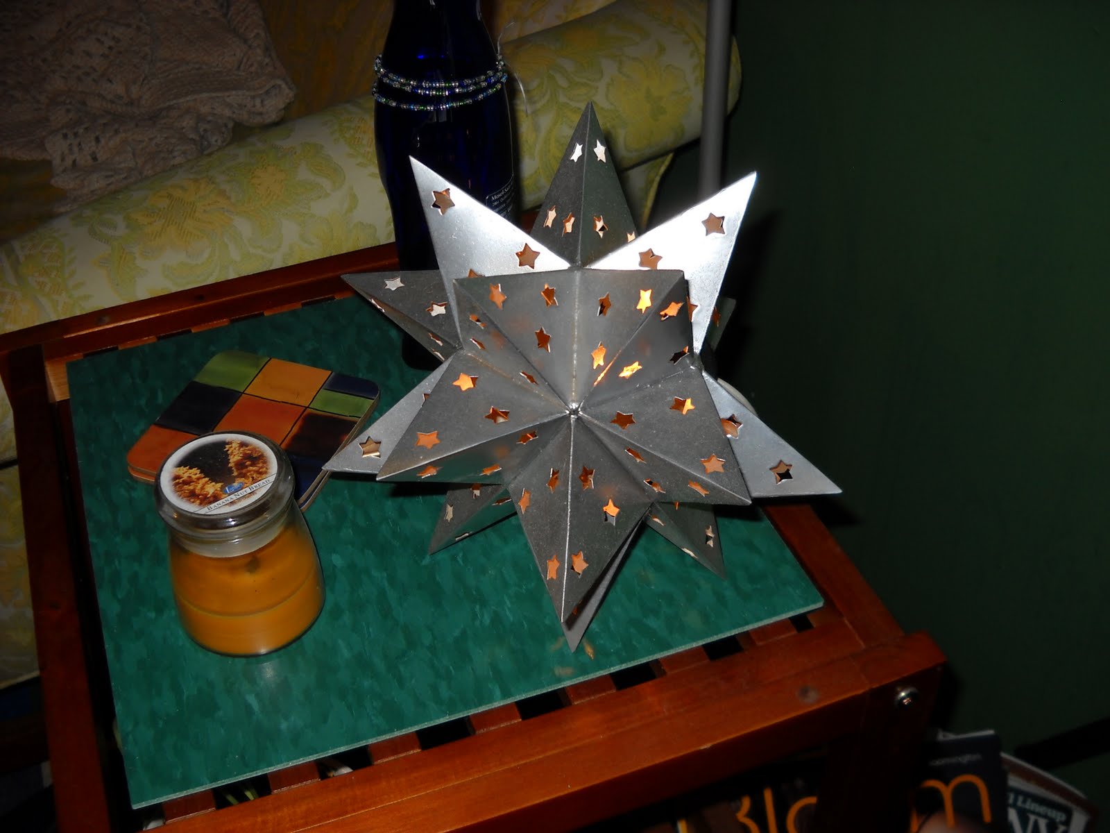 The metal star thingy on the right. I will have to take a better picture of it to post. It was a Christmas tree topper in some old decorations a woman brought to work and said she didn't want anymore. It was a bronze/gold color - again with the trusty can of silver spray paint. It turns out it is too heavy for the top of my Christmas tree so next I took my handy hacksaw and sawed off the springy cone that makes it fit the top of the tree and taa-daah! a table decoration! I leave it on almost all the time. Where the light shines out it cast star shaped lights on the walls and floors around it. One more of my favorite things that was basically FREE. Y'all are also learning how cheap I am! You really can decorate a house on a budget!